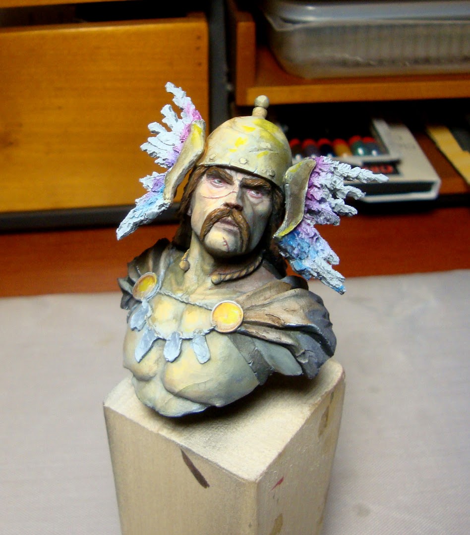 Another thing I wanted to achieve with this project was to distort what is presumably a historical piece and warp it into a fantasy piece. Technically, this bust is my first historical project. But I couldn't resist giving it a twist and slapping it with the fantasy palette.